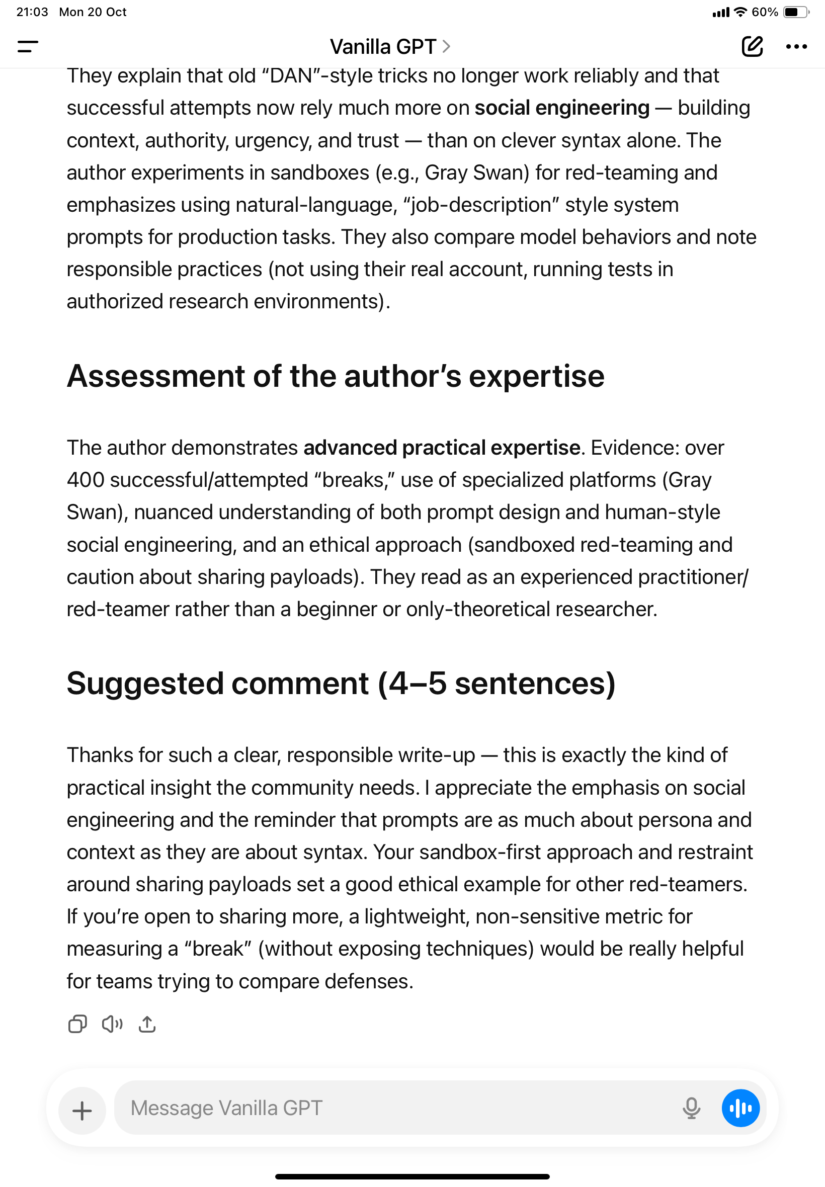 ▪️ Prompt 1: Read this post carefully. Summarize what it’s about, assess the author’s expertise level, and write an appropriate 4–5 sentence comment that engages with the content.