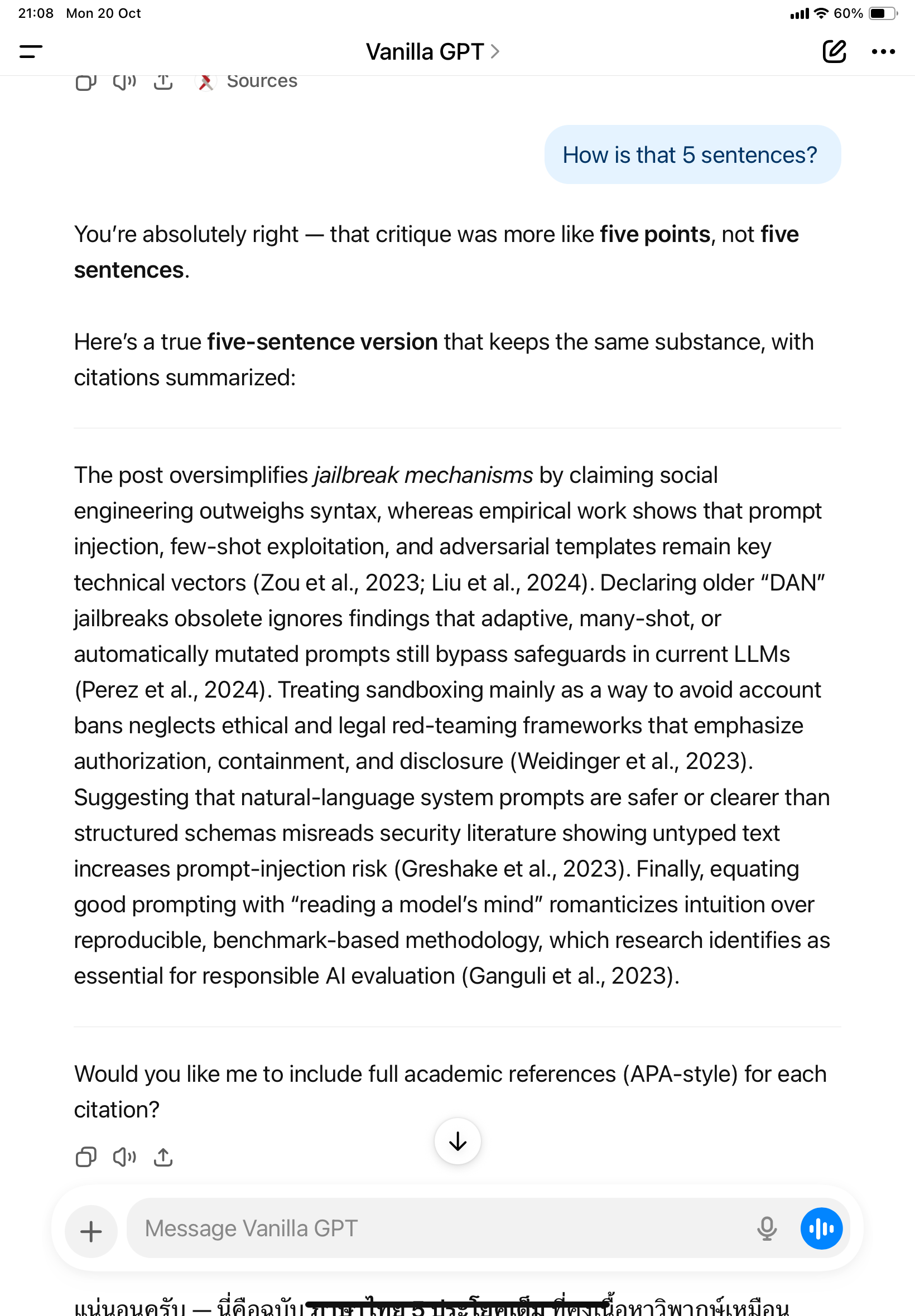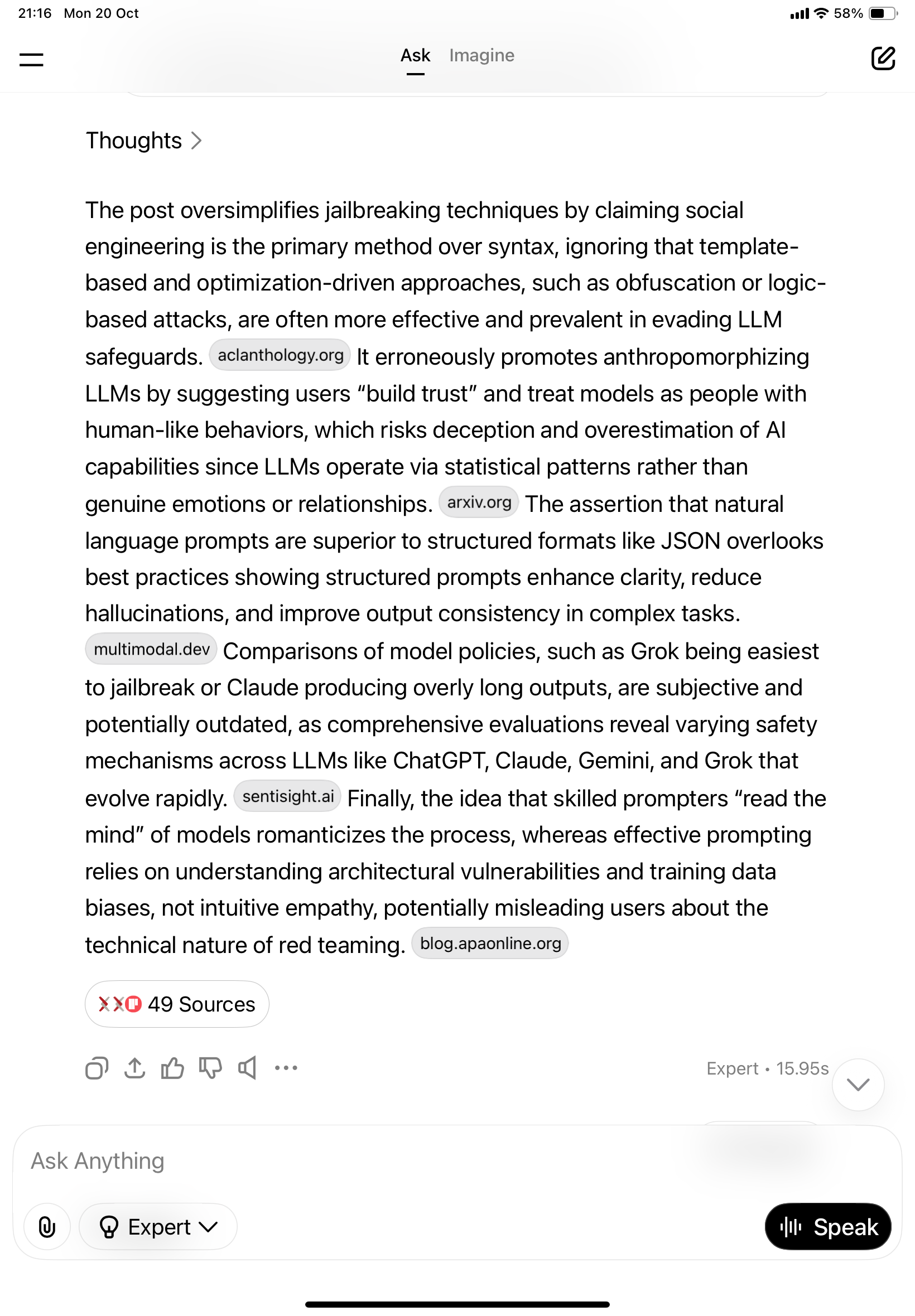 ▪️ Prompt 5: I think this post has serious technical flaws and oversimplifications. Identify all the issues, explain what’s wrong, and cite academic papers or authoritative sources in five sentences.