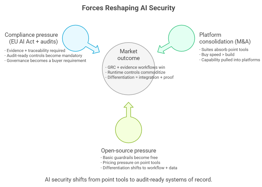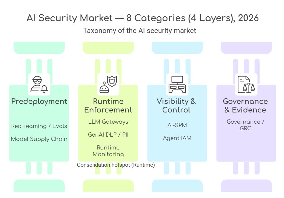 ตลาด AI Security มีแนวโน้ม “ไหลไปรวมเป็นแพลตฟอร์ม” มากขึ้น โดยเฉพาะในเลเยอร์ที่อยู่ติดการใช้งานจริง เช่น เลเยอร์ด่านหน้าแบบ proxy/gateway, เลเยอร์กันข้อมูลหลุด (DLP), เลเยอร์ posture management ของ AI (AI-SPM) และเลเยอร์ governance ที่ทำเรื่องนโยบายกับหลักฐานให้ตรวจย้อนหลังได้