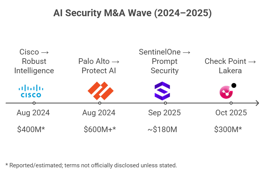 ดีล M&A ช่วงปี 2024 ถึง 2025 หลายดีลก็อยู่ในกลุ่มด่านหน้า หรืออยู่ในสาย runtime/lifecycle security ที่วางตัวใกล้ inference perimeter สะท้อนว่าในบางเคส “ซื้อเอา” อาจเร็วกว่า “สร้างเอง” เมื่ออยากลงตลาดให้ทัน