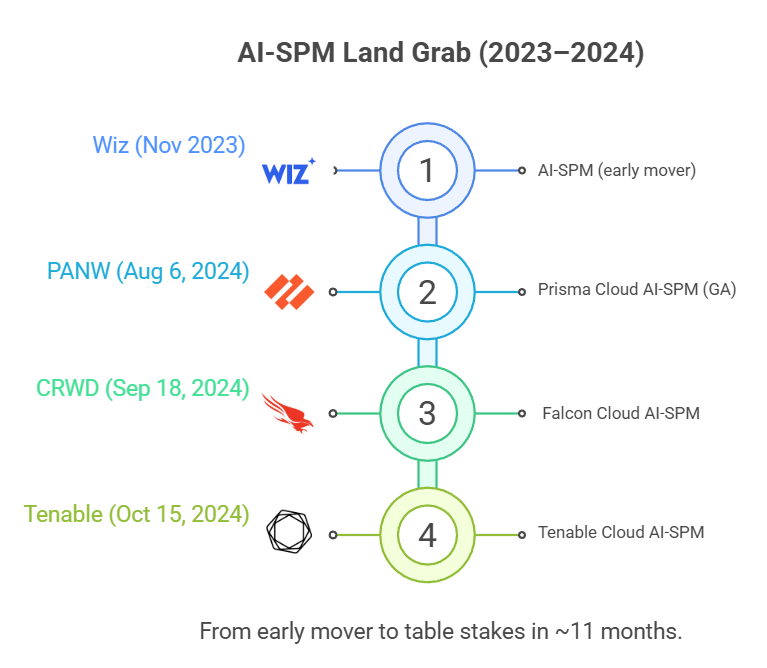 Mini-timeline: Wiz (Nov 2023) → Prisma Cloud GA (Aug 2024) → CrowdStrike (Sep 2024) → Tenable (Oct 2024)